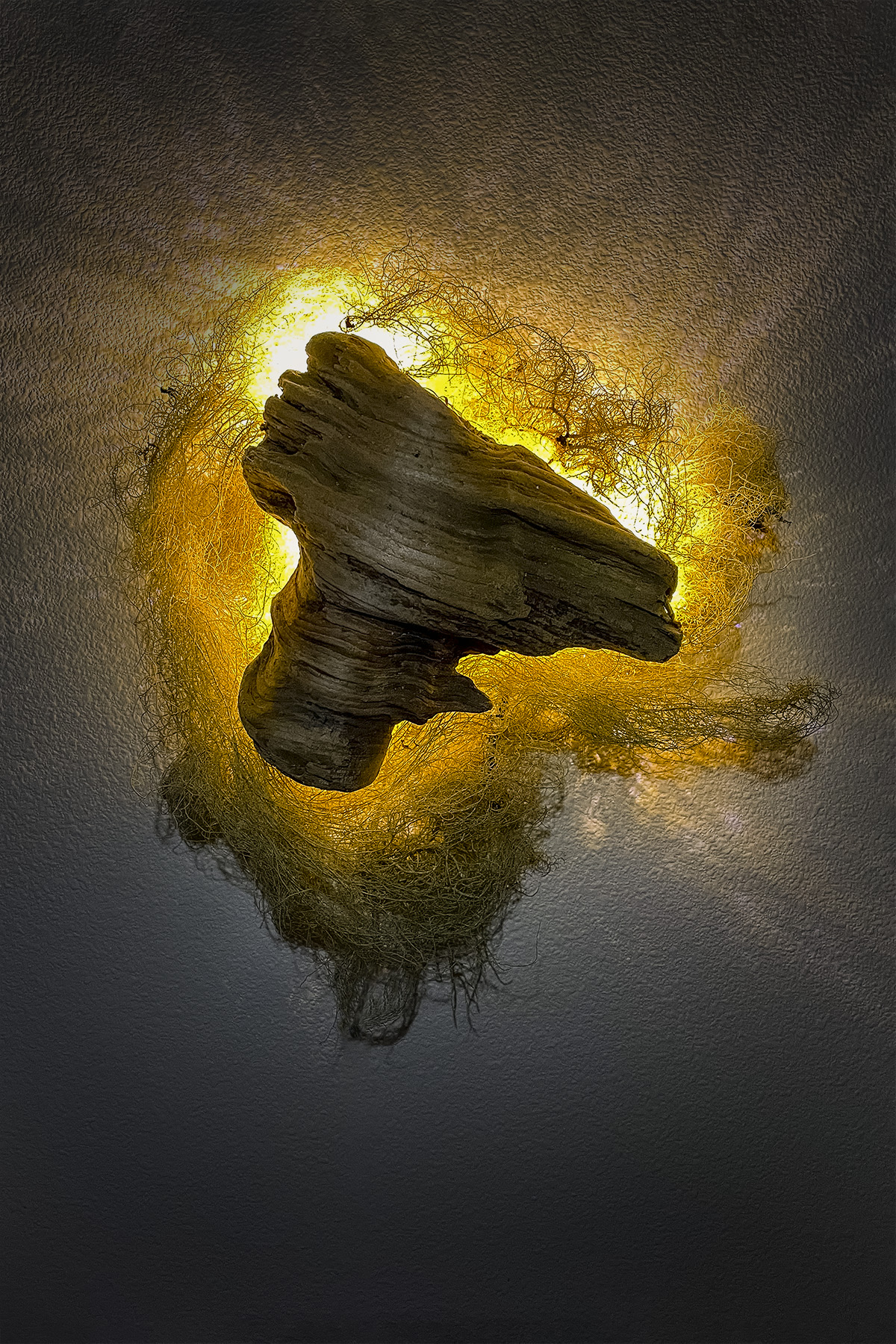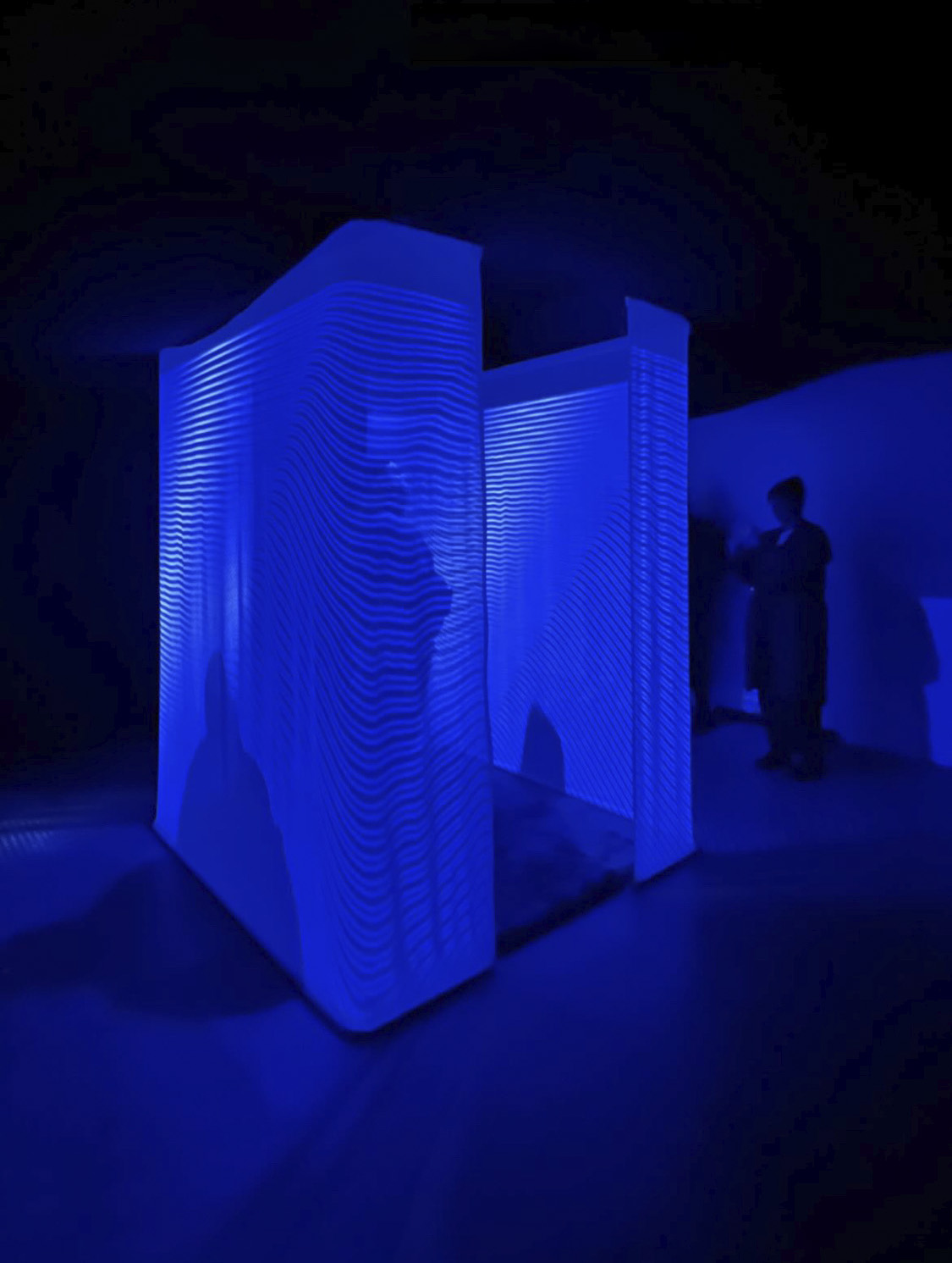 Visitors are ushered into the darkness by small light works before discovering the full-room installation that is the focal point of this show. There, they will navigate the space, each other, and, if they remain still for long enough, perhaps the sequestered locales within their own inner landscape.