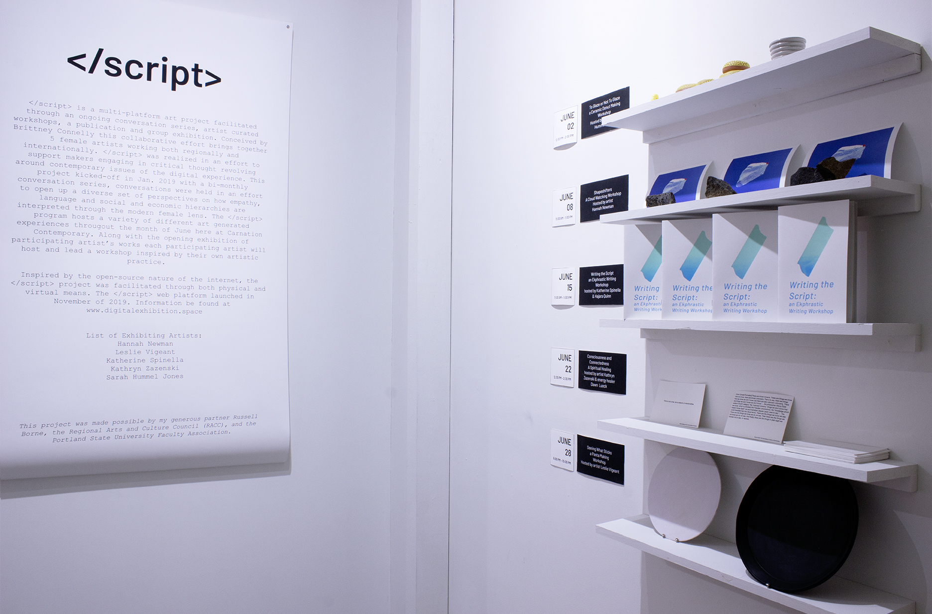 </script> is a multi-platform art project facilitated through an ongoing conversation series, artist curated workshops, a publication and group exhibition. Conceived by Brittney Connelly, this collaborative effort brings together 5 female artists working both regionally and nationally. </script> was realized in an effort to support makers engaging in critical thought revolving around contemporary issues of the digital experience. Conversations were held in an effort to open up a diverse set of perspectives on how empathy, language, and social and economic hierarchies are interpreted through the modern female lens. In addition to the June 1st exhibition, the <script> program will host a variety of different artist curated workshops. These workshops are free & open to the public, for more details check out links below.